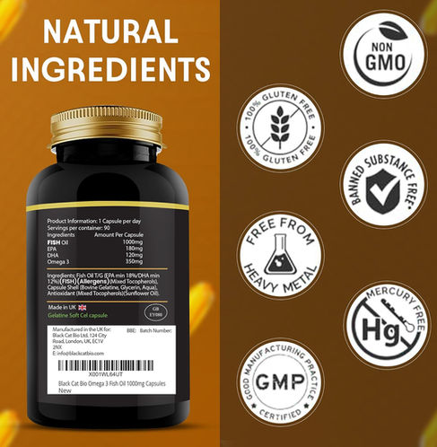 Optimal Potency: Each Black Cat Bio omega 3 1000mg capsules contains 1000mg of pure fish oil, ensuring an optimal dosage of Omega 3. The formulation includes a balanced combination of 180mg EPA (eicosatetraenoic acid) and 120mg DHA (docosahexaenoic acid) per capsule.